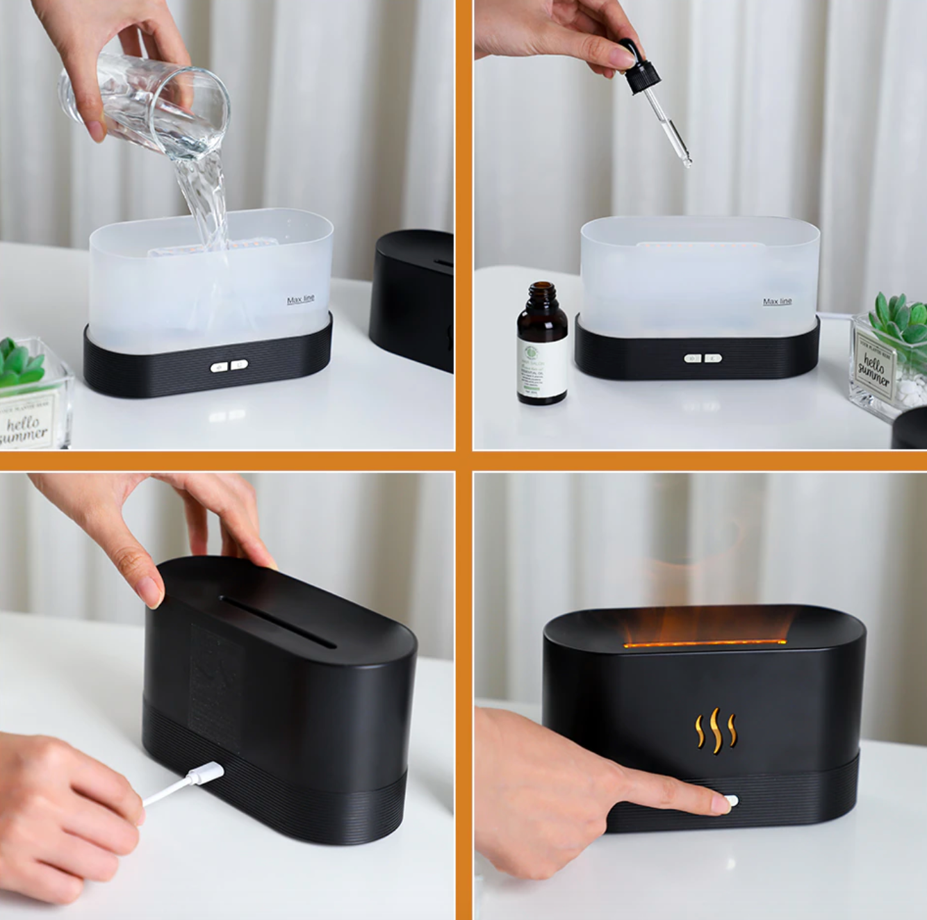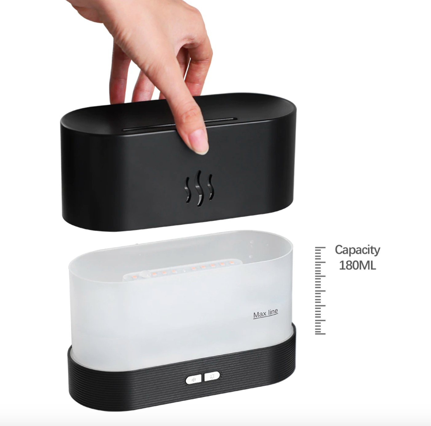 جهاز عملي يعمل بتقنية الرذاذ البارد لنشر الزيوت العطرية في الهواء، مع إضاءة مدمجة تعطي تأثير لهب واقعي وآمن. مناسب لغرفة النوم، الصالون، المكتب أو حتى جلسات الاسترخاء