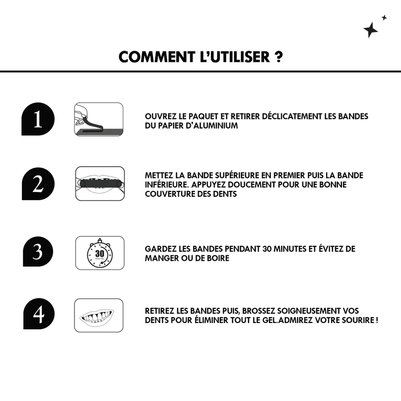 الفحم النشط كيلتقط الشوائب والتصبغات، والشرائط كتثبت بسهولة على الأسنان باش تعطي مفعول متساوي على كامل السطح